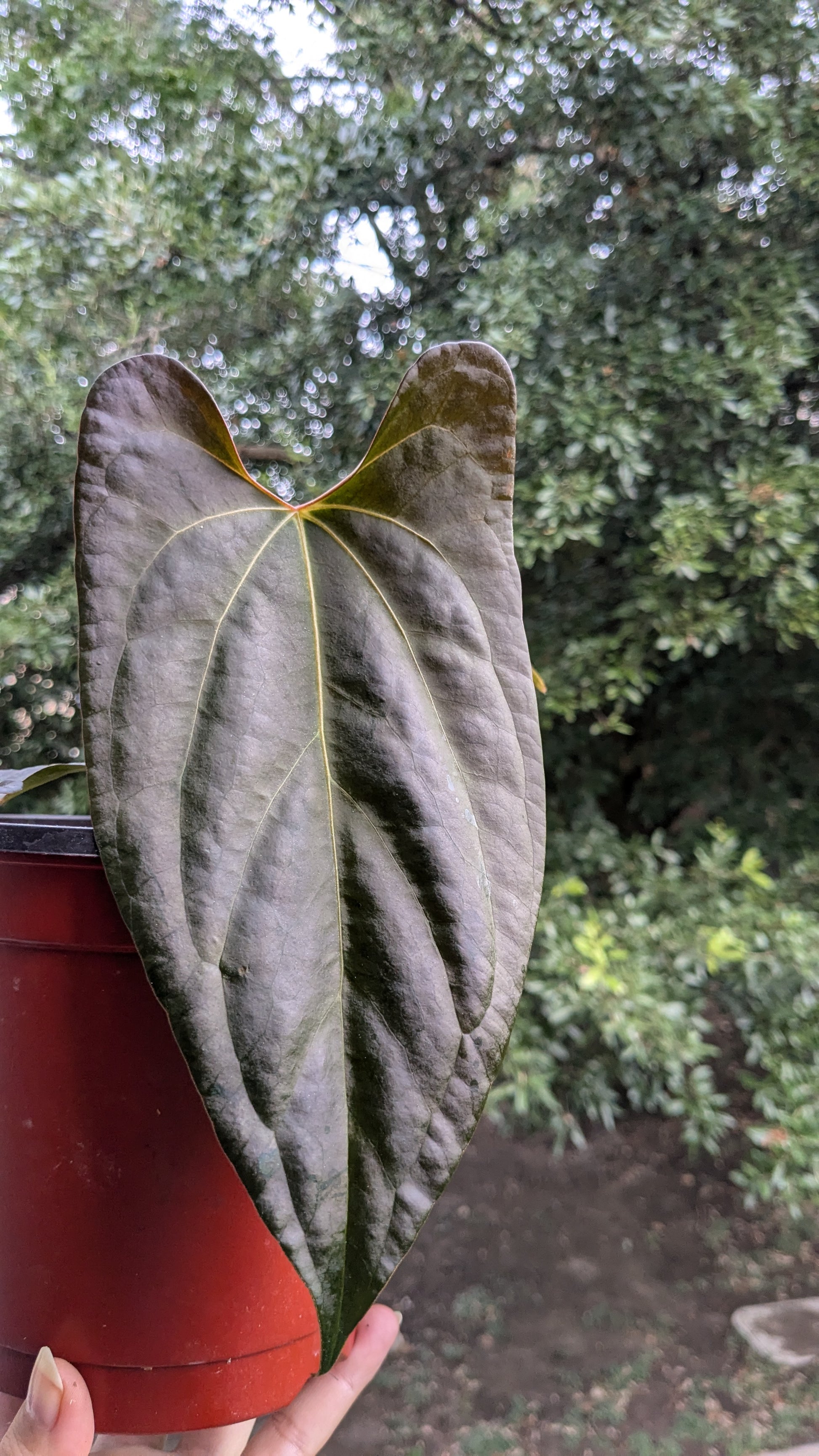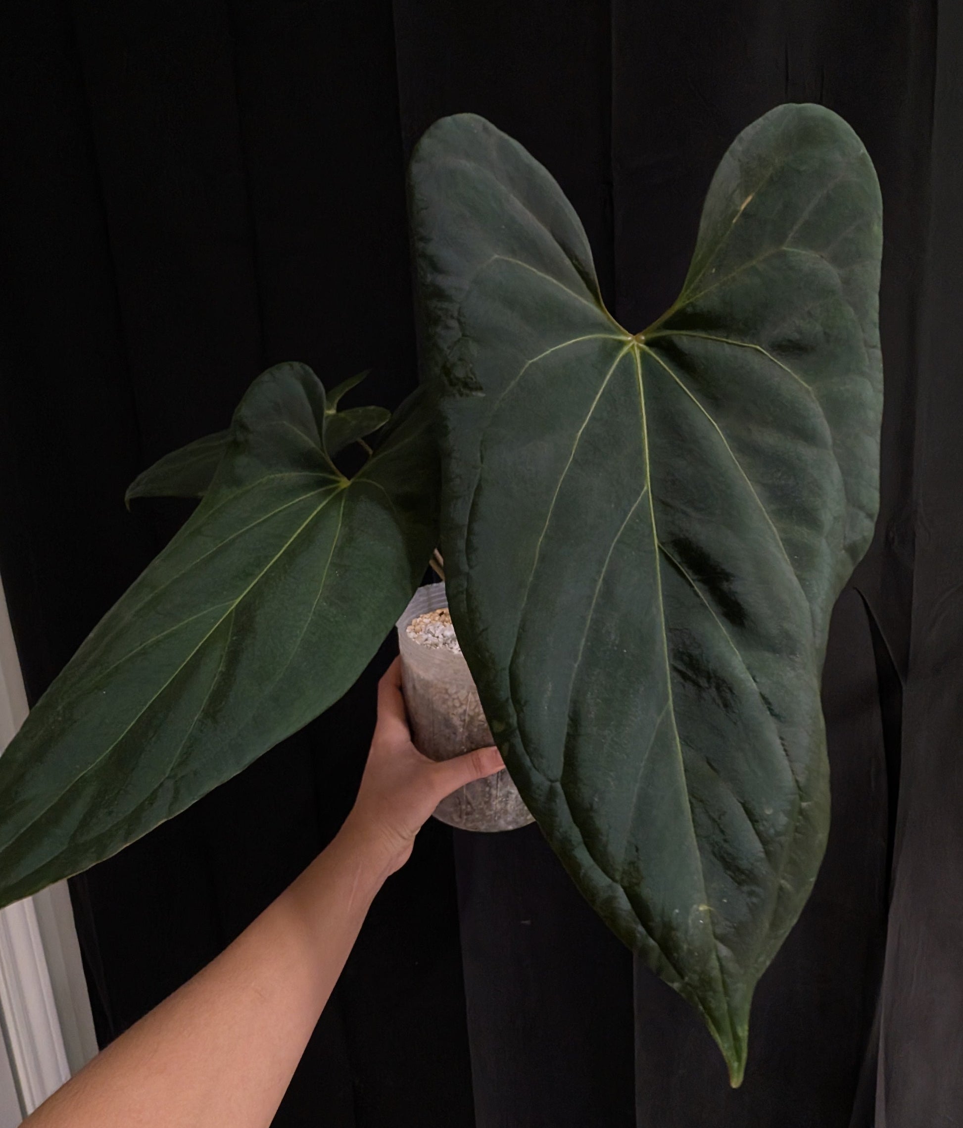 A gorgeous NOID Anthurium with large, dark, velvety leaves and subtle primary veining. Imported from Indonesia, this plant has an elegant, mature look that stands out in any collection. Perfect for collectors who love unique, understated foliage.