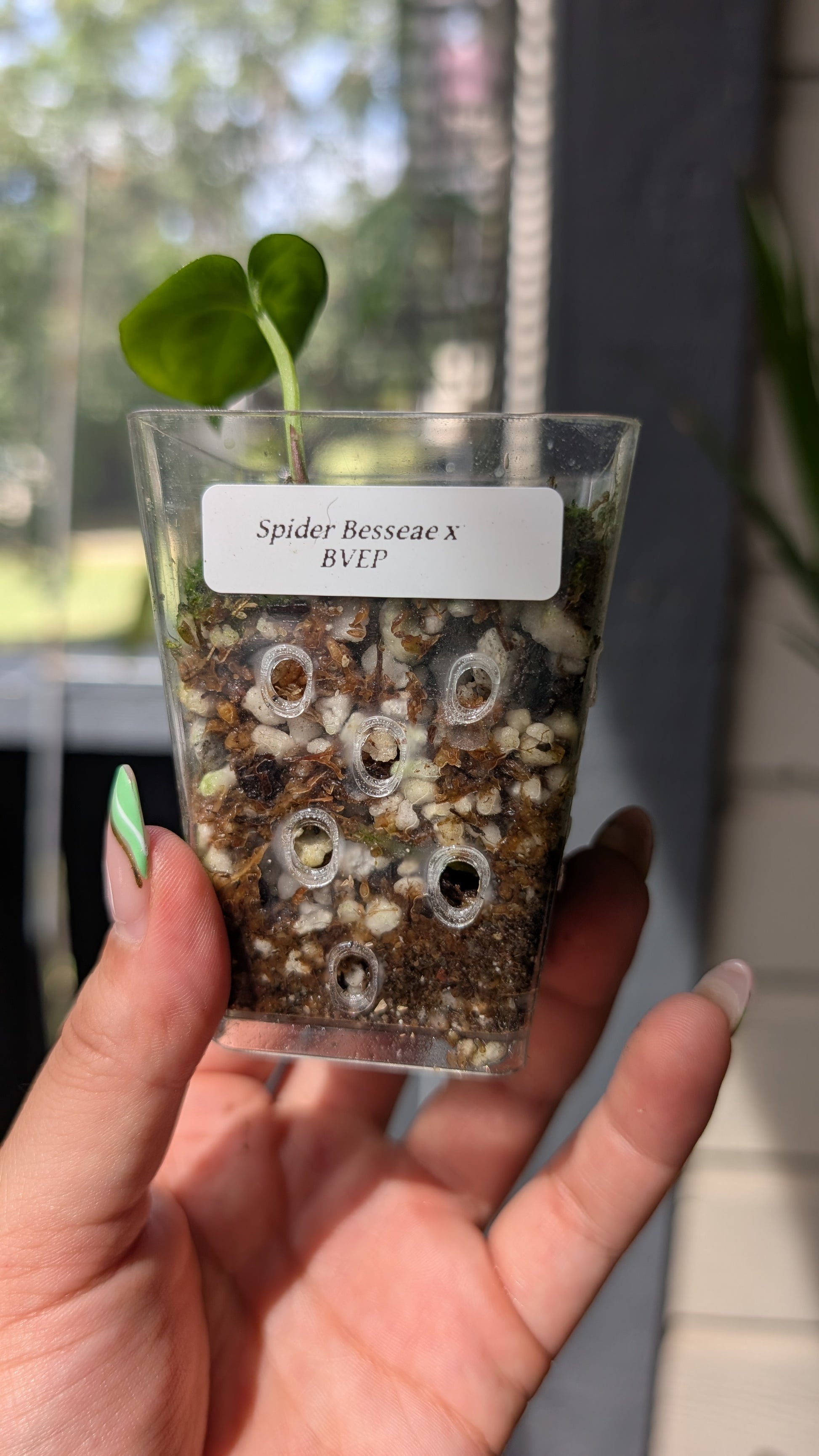 Bring home this striking Spider besseae x BVEP clone, ready to grow large velvety, dark leaves traced with bold veining. Cut from the healthy mother plant pictured, this rare hybrid is perfect for collectors looking to add unique texture and drama to their indoor jungle. 🌱✨